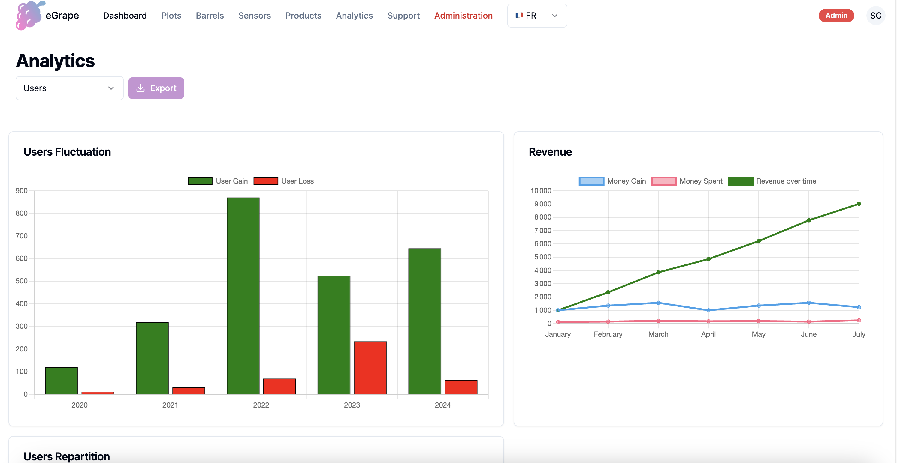 Sur la page cuves, vous pouvez voir les informations de vos cuves. L'étiquette de couleur au dessus de chacunes de vos cuves vous permet de savoir si la cuve est en bon fonctionnement ou non. Vous pouvez ajouter une nouvelle cuve en cliquant sur le bouton "+" en bas à droite. Entrez toutes les données de votre cuve et cliquez sur le bouton "Ajouter". Si vous voulez apporter des modifications ou supprimer cette cuve, cliquez sur le bouton "Modifier".